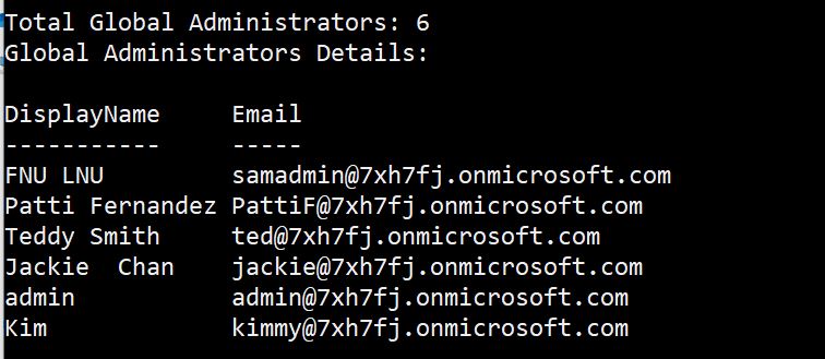 Note: Replace "Global Administrator" with the display name of the administrator whose details you want to fetch (example: "Exchange Administrator") in the script to suit your requirements.