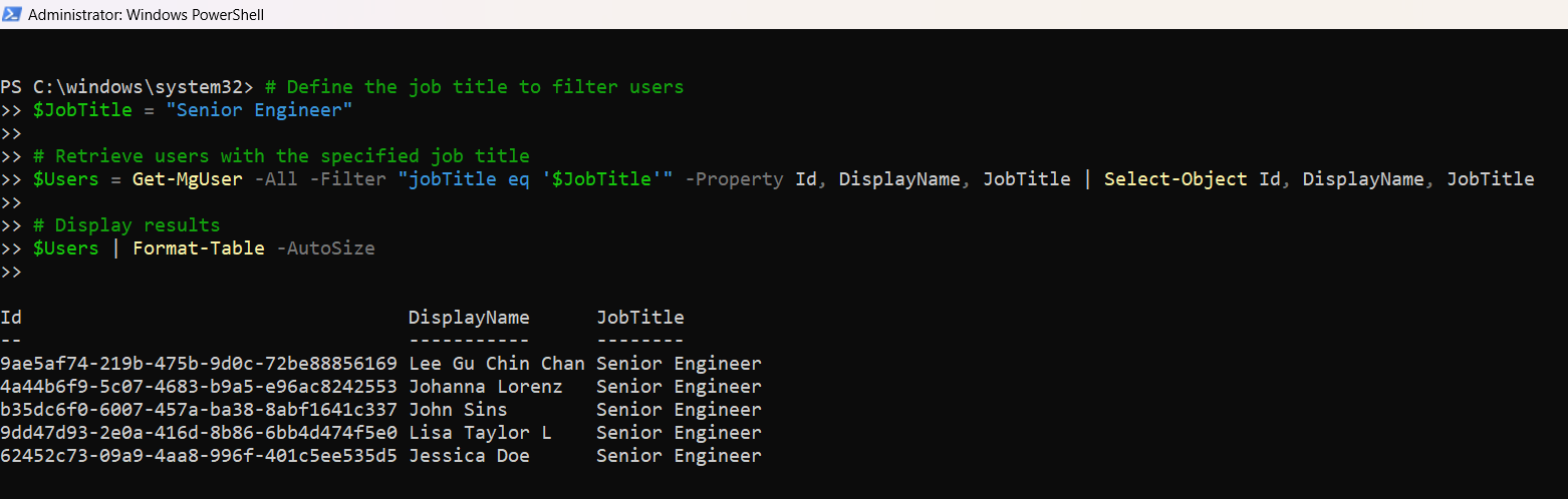 $Users = Get-MgUser -All -Filter "jobTitle eq '$JobTitle'" -Property Id, DisplayName, JobTitle | Select-Object Id, DisplayName, JobTitle
