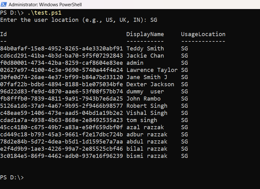 $Users = Get-MgUser -All -Filter "usageLocation eq '$UserLocation'" -Property Id, DisplayName, UsageLocation | Select-Object Id, DisplayName, UsageLocation
