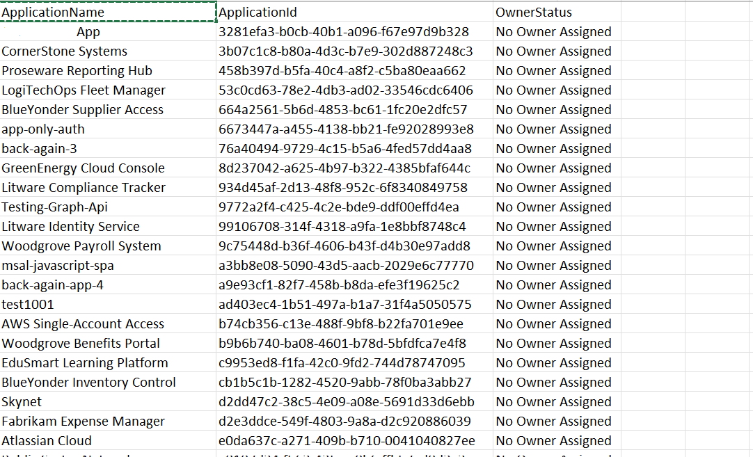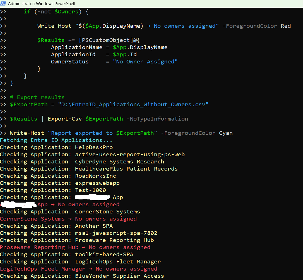 Using Microsoft Graph PowerShell, administrators can easily identify such applications and generate a report for remediation. The script below retrieves all Entra ID applications and lists those that do not have any assigned owners, exporting the results to a CSV file for review.