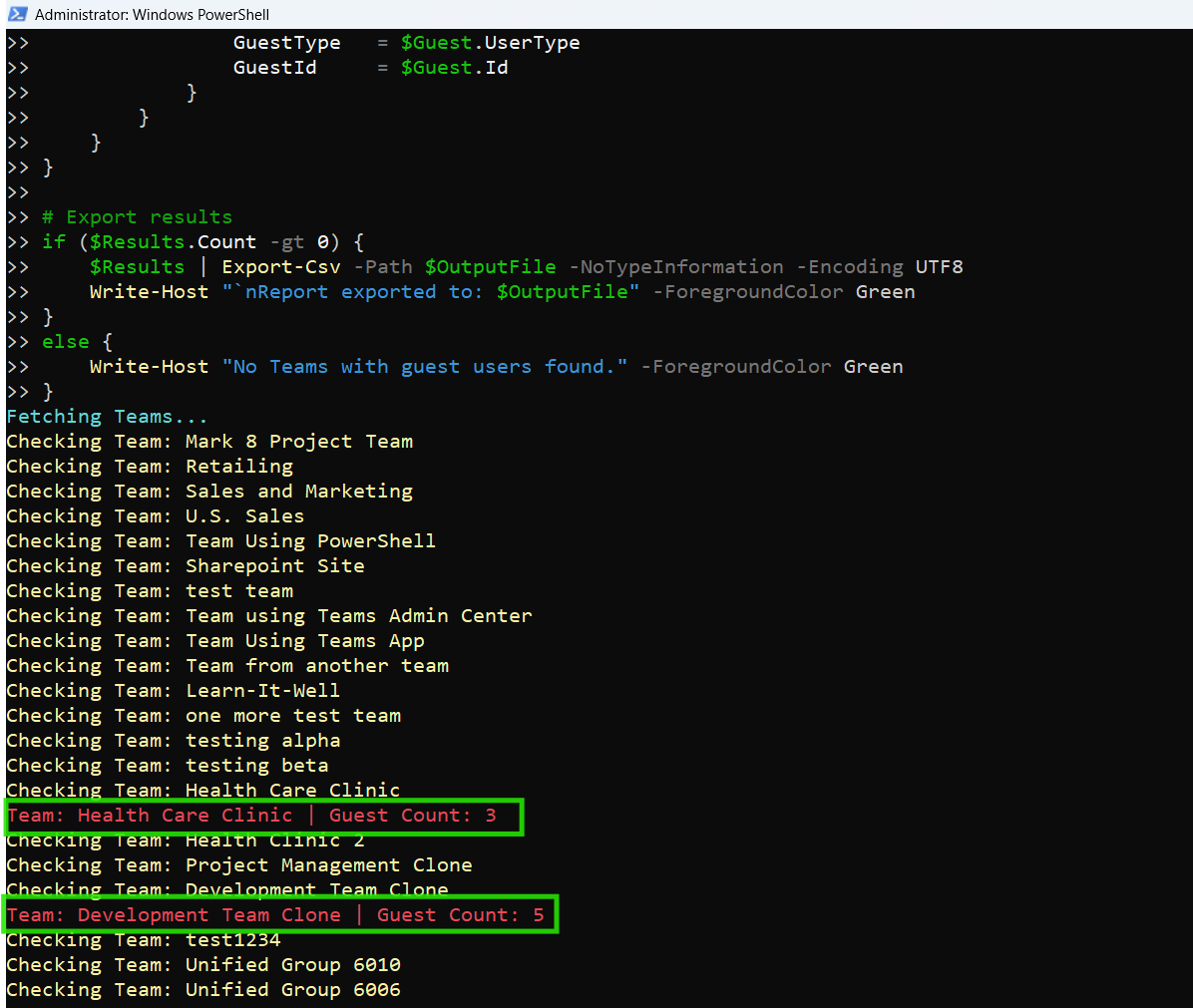 This Microsoft Graph PowerShell script provides an effective way to identify Teams with external (guest) users and generate a detailed report. By regularly auditing guest access, administrators can ensure: