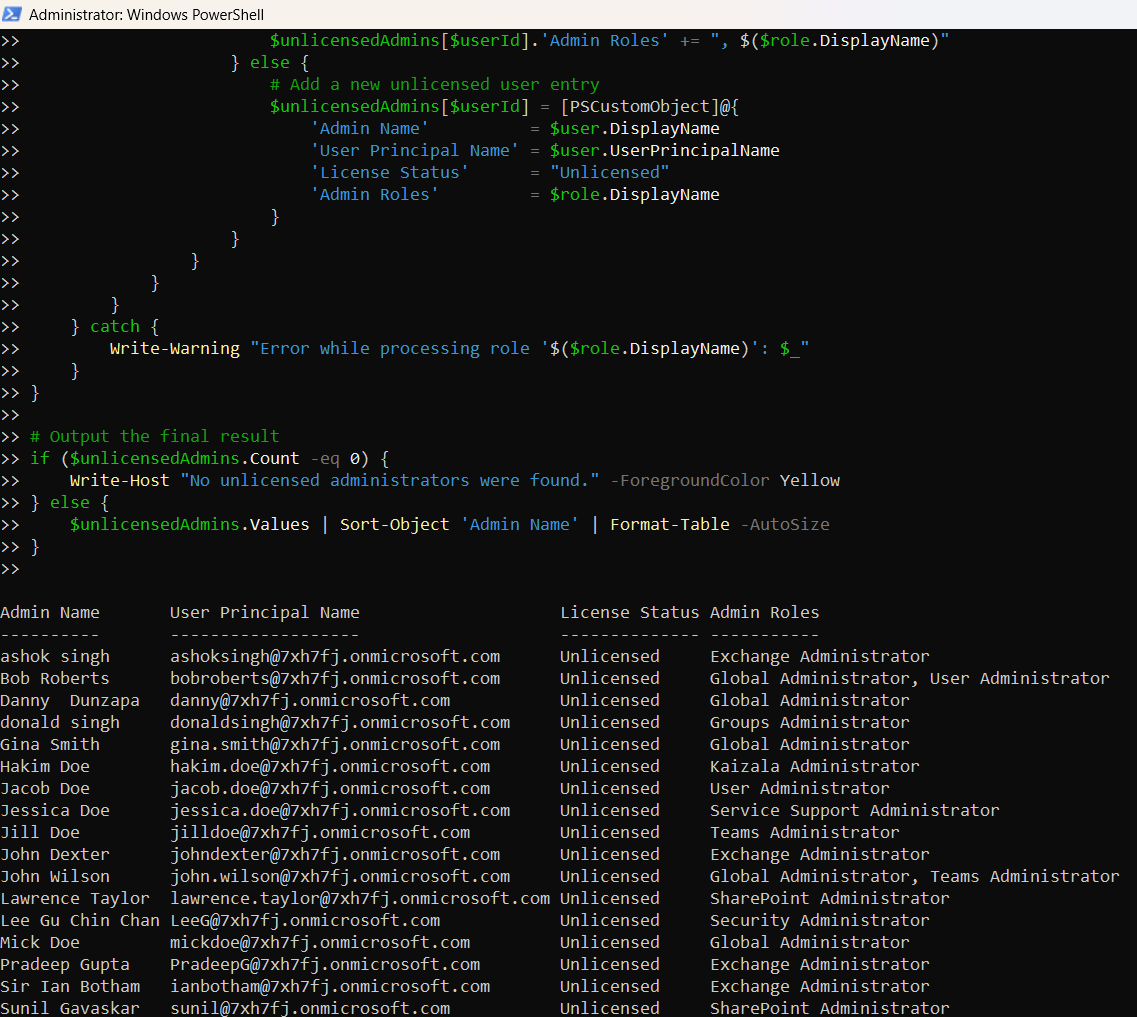 Write-Host "No unlicensed administrators were found." -ForegroundColor Yellow