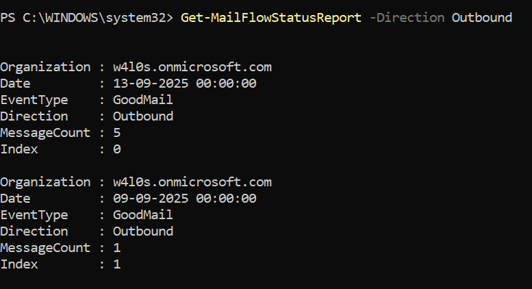 🚀 Launch ToolkitThe Get-MailFlowStatusReport cmdlet in Exchange Online PowerShell is used to retrieve mail flow statistics across your Microsoft 365 organization. It provides a summary view of the status of email delivery over a specified reporting period, showing details like: i)The number of messages sent and received, ii)Delivery status (success, deferred, failed), iii) Trends in mail flow volume, iv)Overall health of your mail transport service.