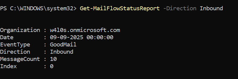 Get-MailFlowStatusReport -Direction Inbound -StartDate (Get-Date).AddDays(-7) -EndDate (Get-Date)