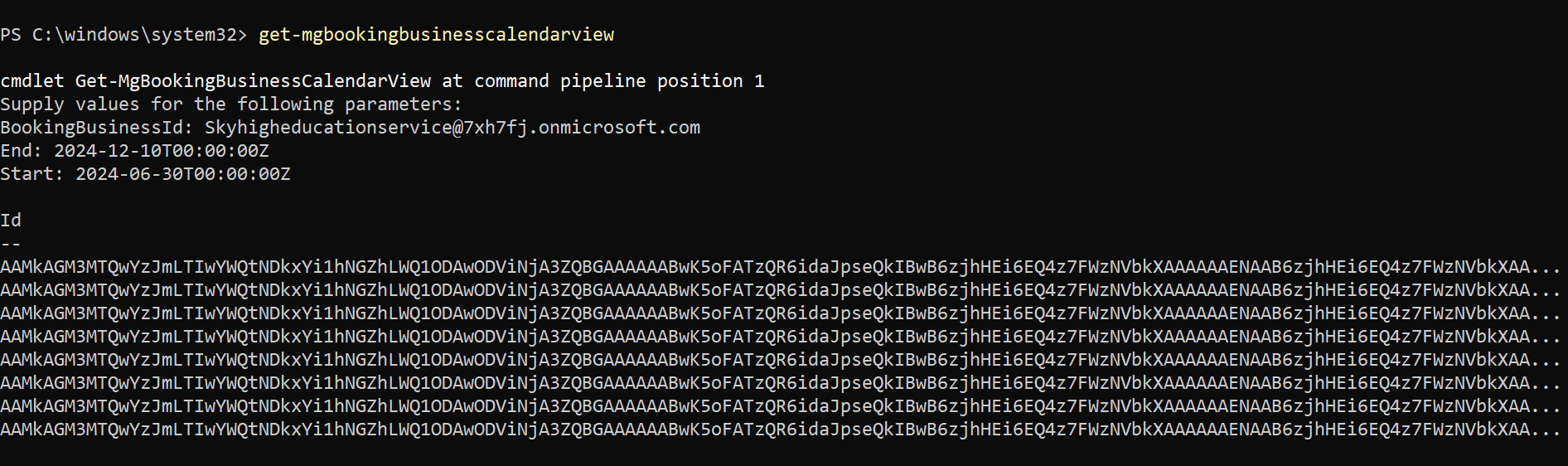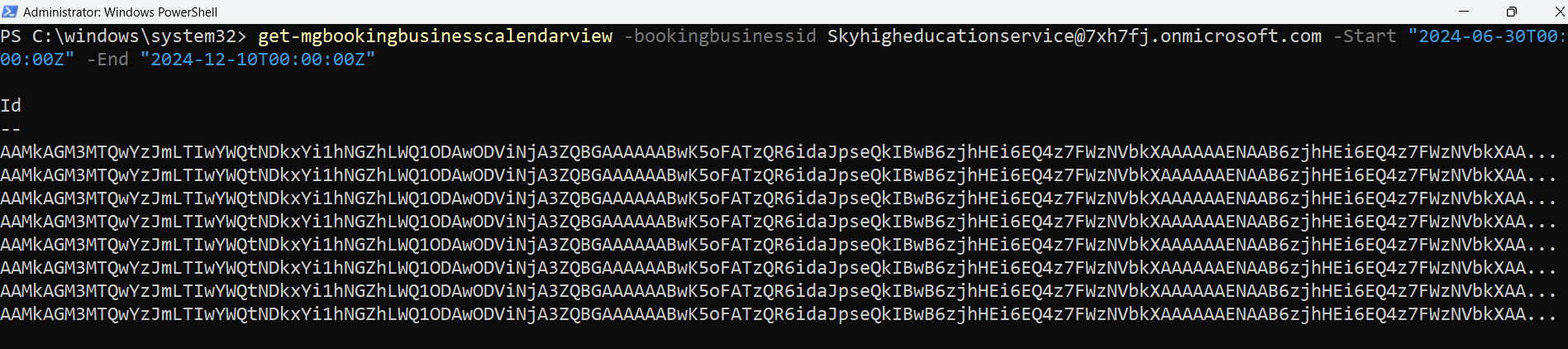 Get-MgBookingBusinessCalendarView -BookingBusinessId "Skyhigheducationservice@7xh7fj.onmicrosoft.com" -Start "2024-06-30T00:00:00Z" -End "2024-12-10T00:00:00Z"