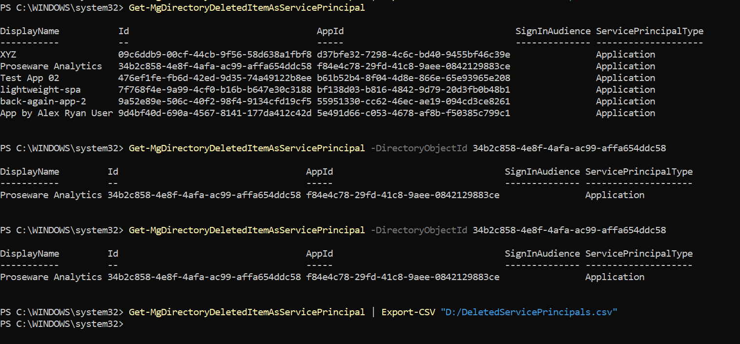 Get-MgDirectoryDeletedItemAsServicePrincipal | Export-CSV "D:/DeletedServicePrincipals.csv"
