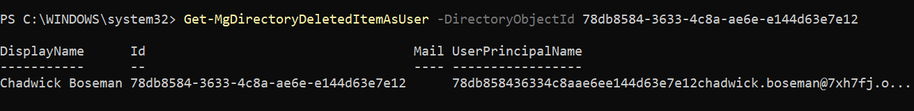 Get-MgDirectoryDeletedItemAsUser -DirectoryObjectId 78db8584-3633-4c8a-ae6e-e144d63e7e12