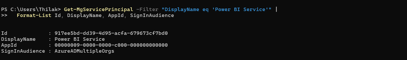 Get-MgServicePrincipal -Filter "DisplayName eq 'Power BI Service'" | Format-List Id, DisplayName, AppId, SignInAudience