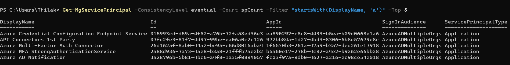 Get-MgServicePrincipal -ConsistencyLevel eventual -Count spCount -Filter "startsWith(DisplayName, 'a')" -Top 5