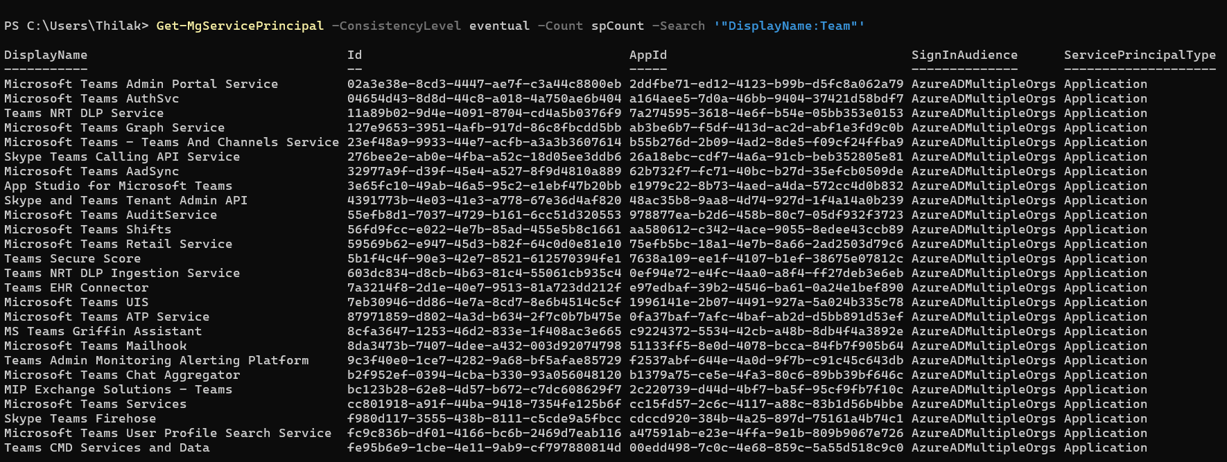 Get-MgServicePrincipal -ConsistencyLevel eventual -Count spCount -Search '"DisplayName:Team"'