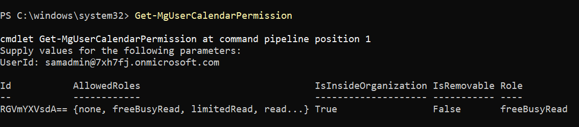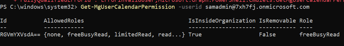 Get-MgUserCalendarPermission -UserId "samadmin@7xh7fj.onmicrosoft.com"