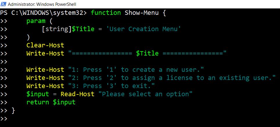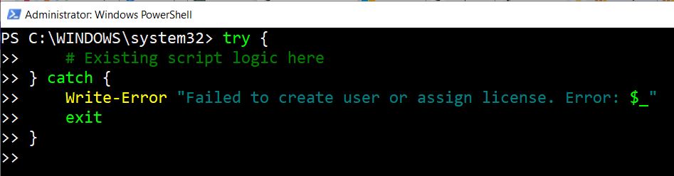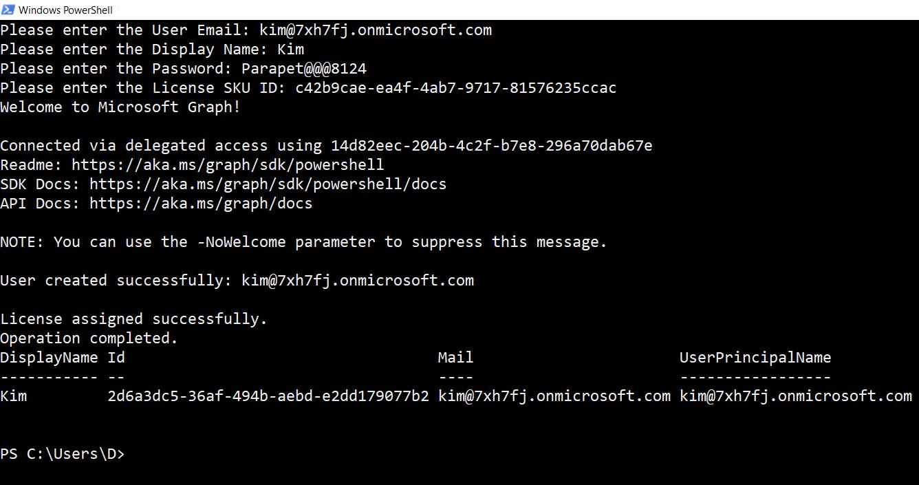 - Script Execution: After entering the details, the script will connect to Microsoft Graph, create the user, and assign the specified license. Messages will be displayed in the PowerShell window indicating the progress and the outcome of each step.