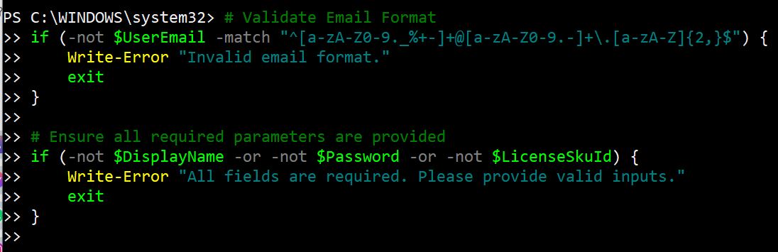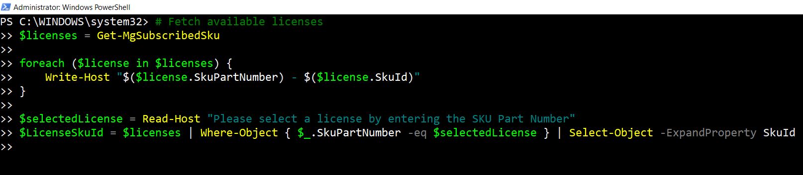 - Automating License SKU ID Selection: Allow users to select from a list of available licenses instead of manually entering the SKU ID. This can be achieved by fetching available licenses and letting the user choose.