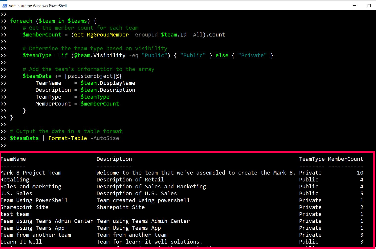 This Graph PowerShell script provides a powerful way to query and manage Microsoft Teams within your organization. By displaying essential data such as Team Name, Description, Team Type, and Member Count, you can gain valuable insights into your Teams environment. With potential enhancements like exporting data or adding more properties, this script can be tailored to meet specific administrative needs.