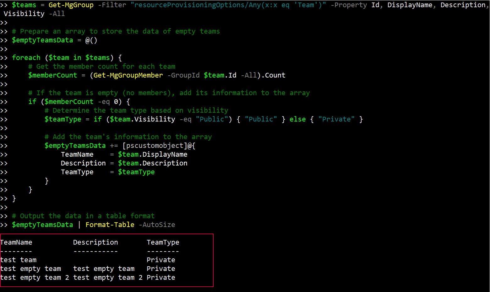 Below is the Graph PowerShell script that checks for empty Microsoft Teams and outputs the relevant data in a tabular format: