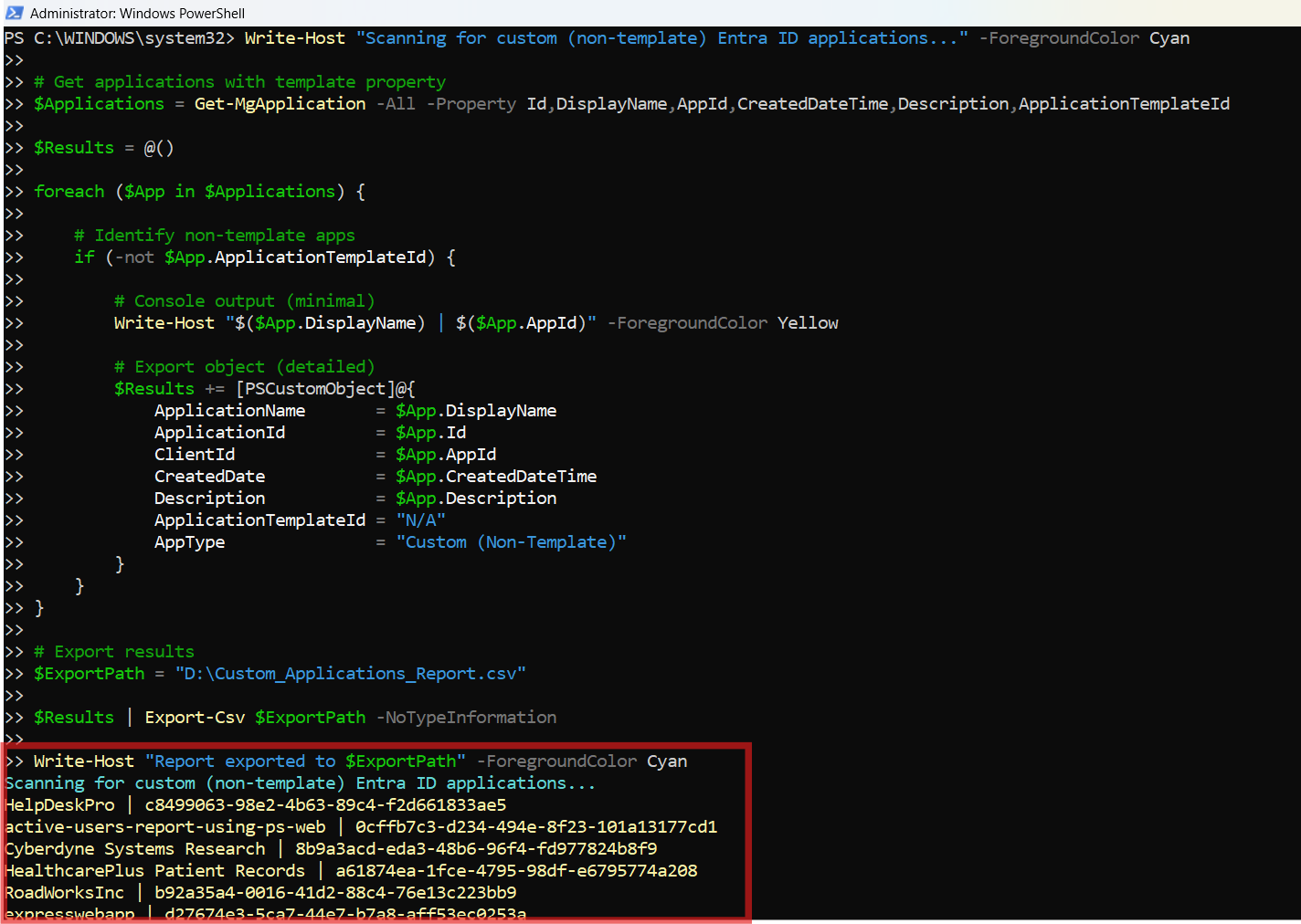 This Microsoft Graph PowerShell script provides a straightforward way to identify, list, and export all custom (non-template) Entra applications, helping administrators gain better visibility into their environment.