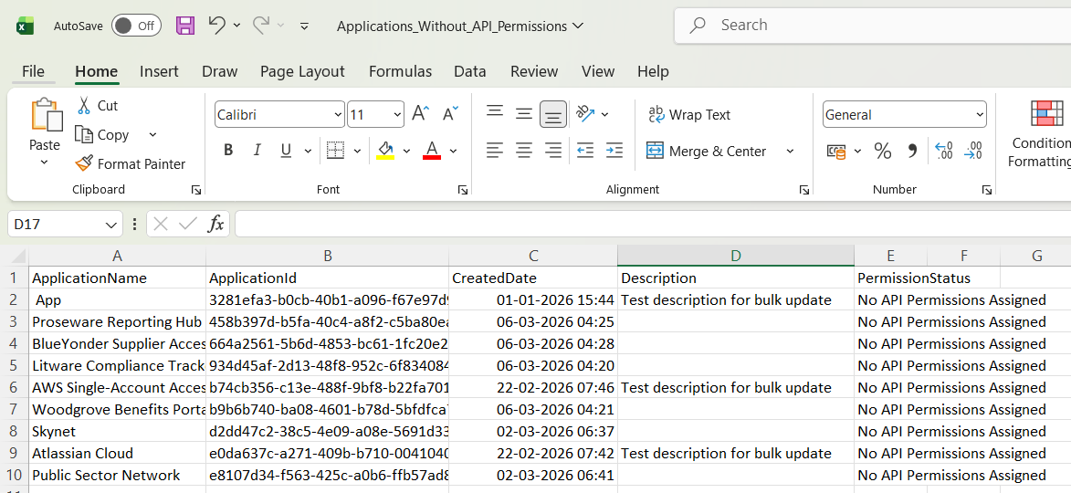All identified applications are exported to a CSV file: D:\Applications_Without_API_Permissions.csv