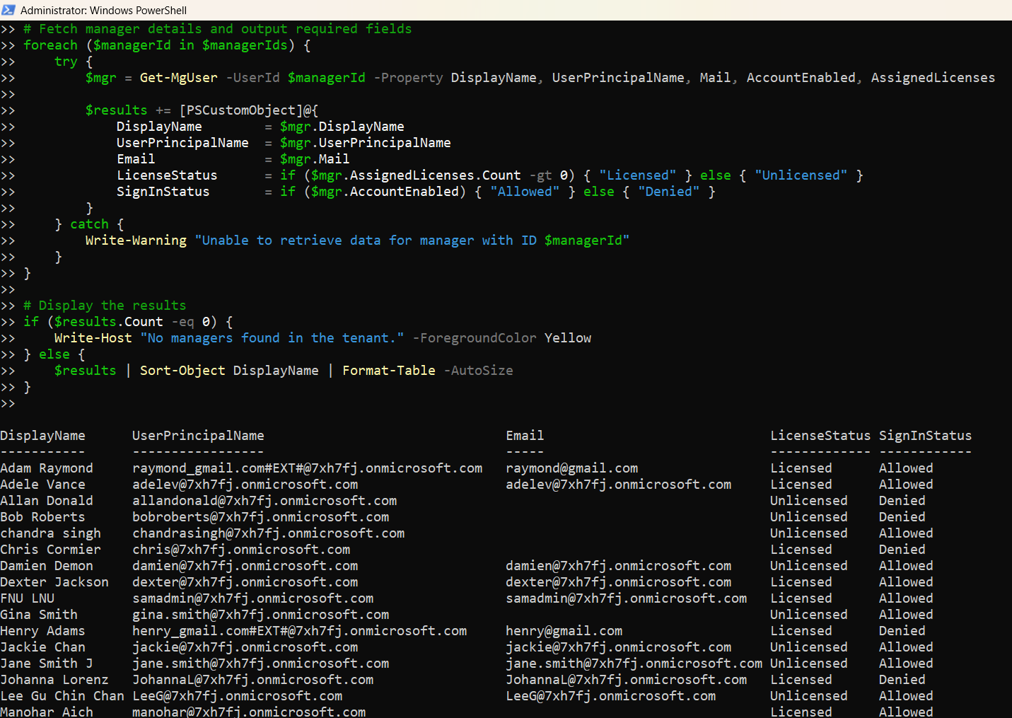 It builds a formatted output showing each manager’s license status and whether their sign-in is allowed.