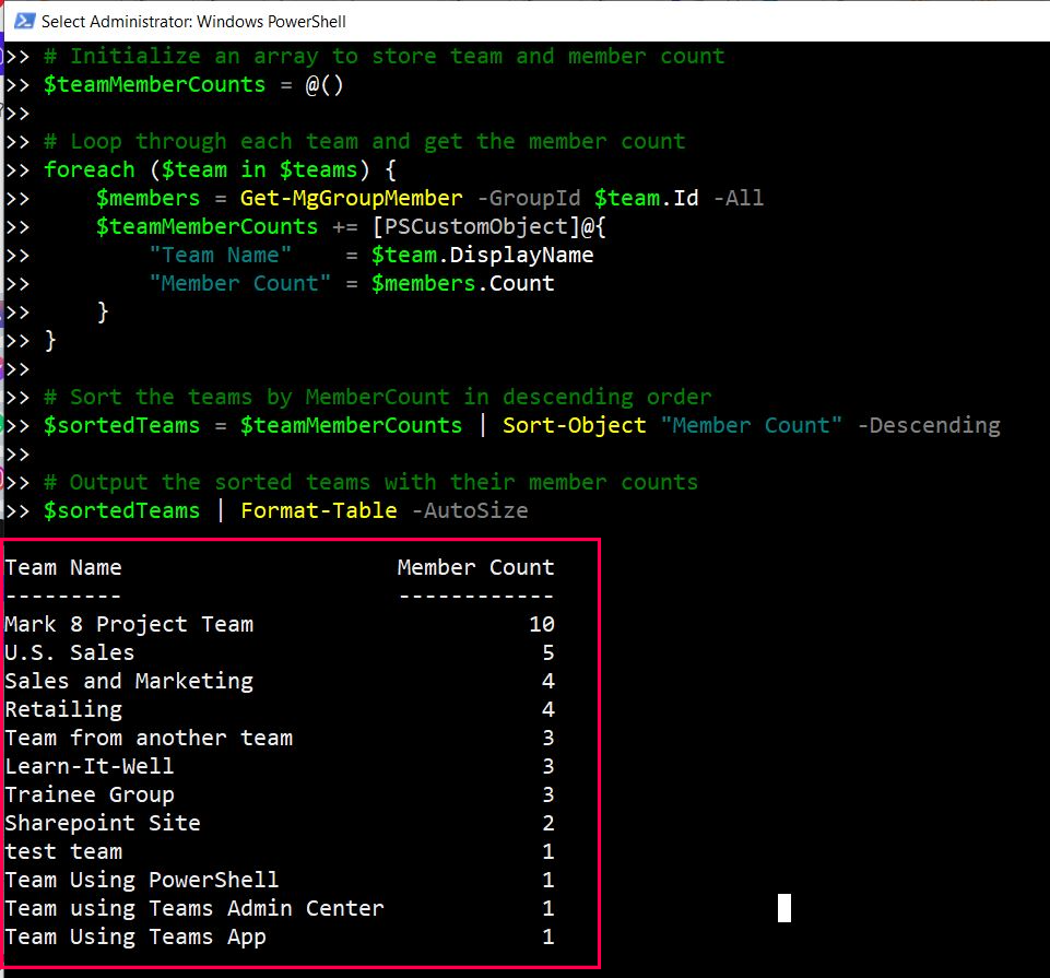 $sortedTeams = $teamMemberCounts | Sort-Object "Member Count" -Descending