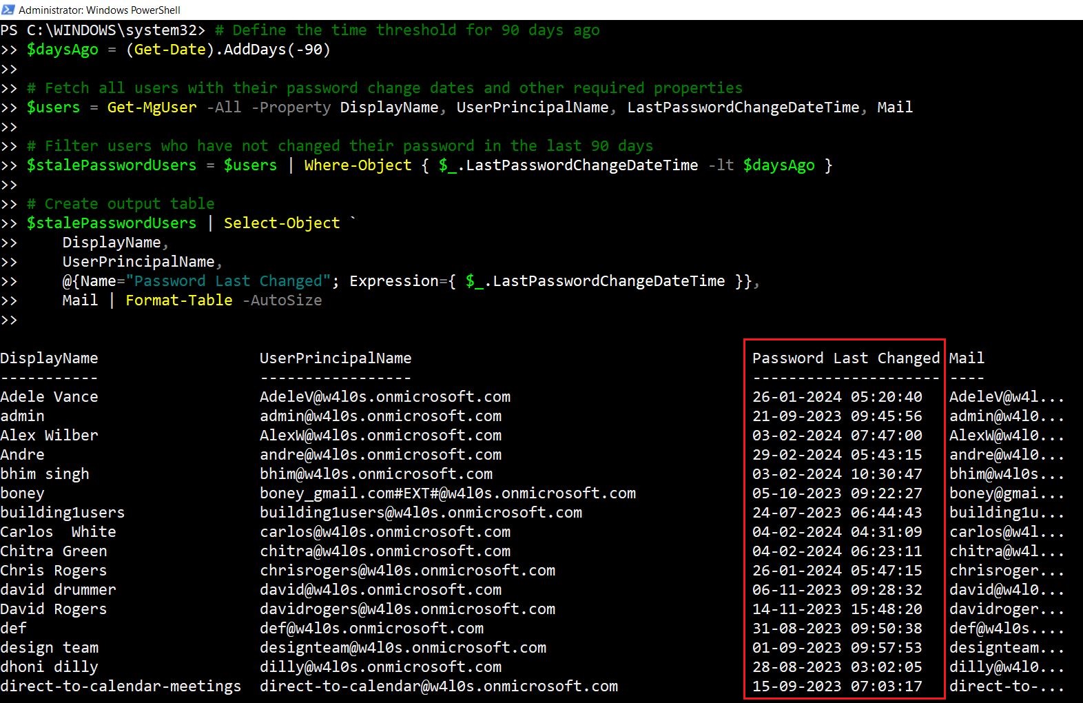 AddDays(-90) method, which subtracts 90 days from the current date.Get-MgUser cmdlet to fetch all users from Azure AD along with their DisplayName, UserPrincipalName, LastPasswordChangeDateTime, and Mail properties.LastPasswordChangeDateTime is older than 90 days using the Where-Object cmdlet.DisplayName, UserPrincipalName, Password Last Changed, and Mail.$stalePasswordUsers | Select-Object DisplayName, UserPrincipalName, @{Name="Password Last Changed"; Expression={ $_.LastPasswordChangeDateTime }}, Mail | Export-Csv -Path "C:\StalePasswordUsers.csv" -NoTypeInformation