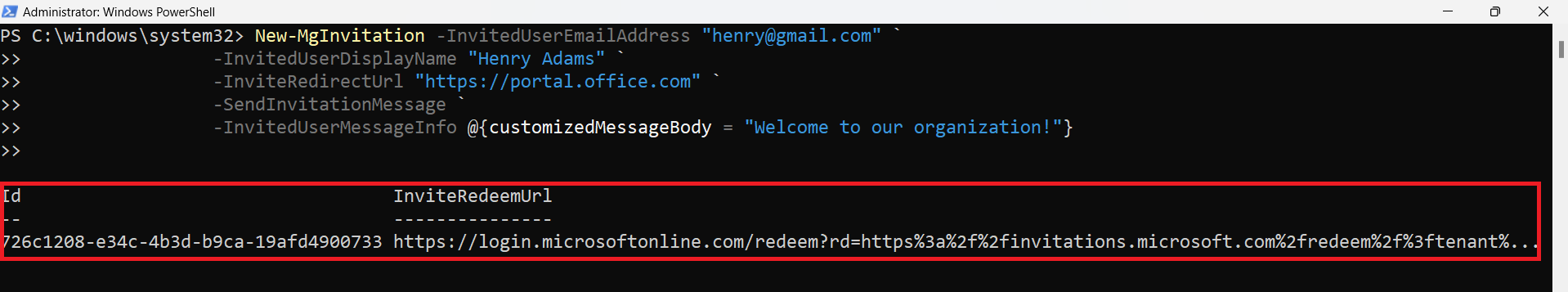$invitation = New-MgInvitation -InvitedUserEmailAddress $guestUserEmail `