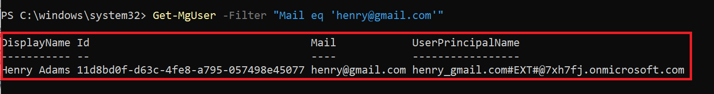 Get-MgUser -Filter "Mail eq 'henry@contoso.com'"