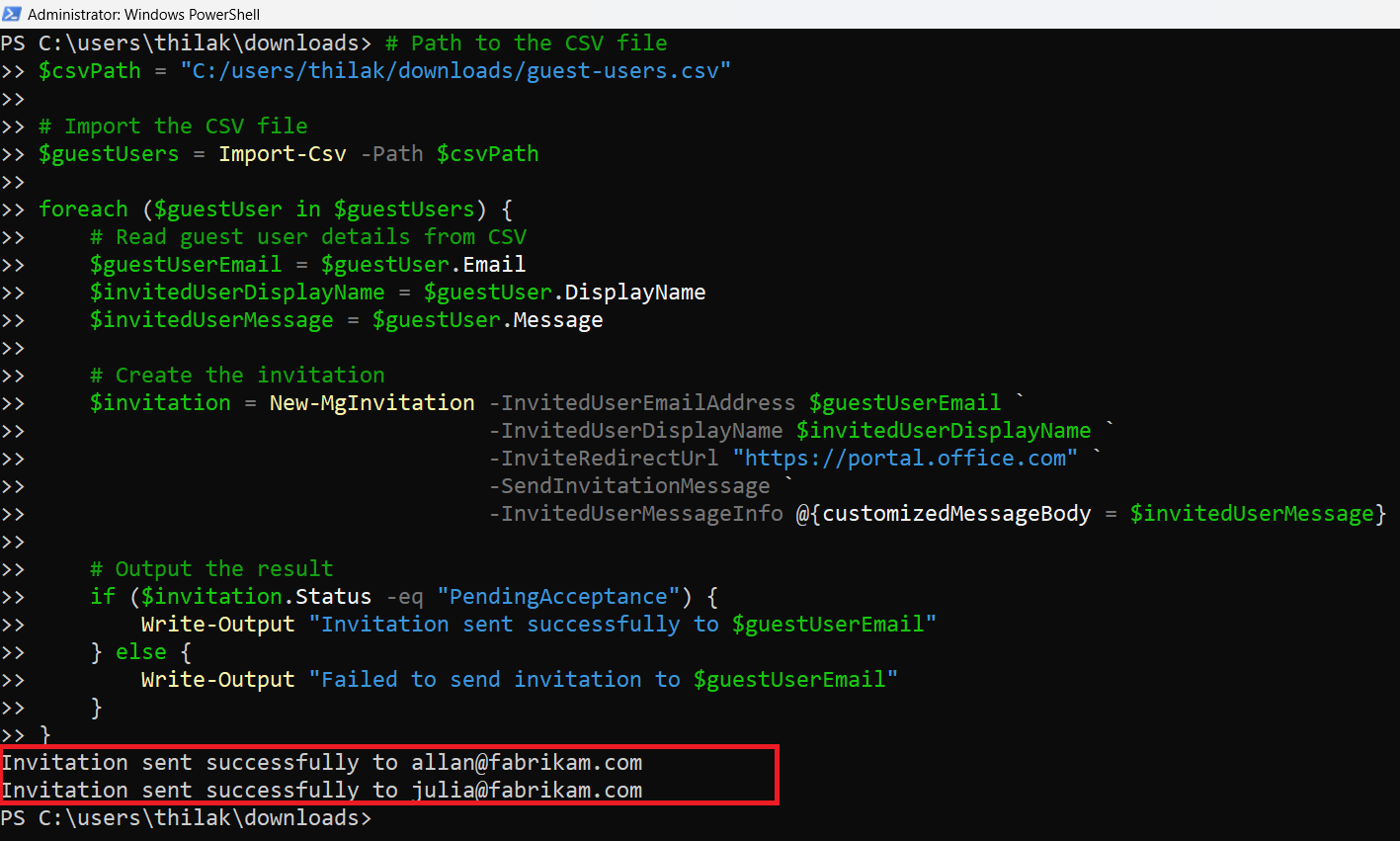 Write-Output "Invitation sent successfully to $guestUserEmail"