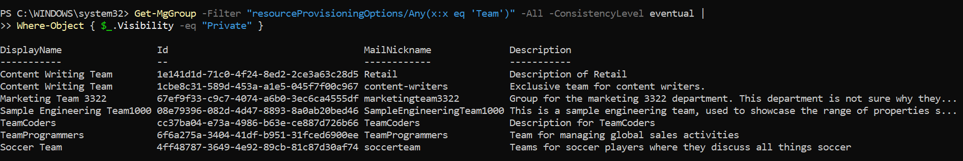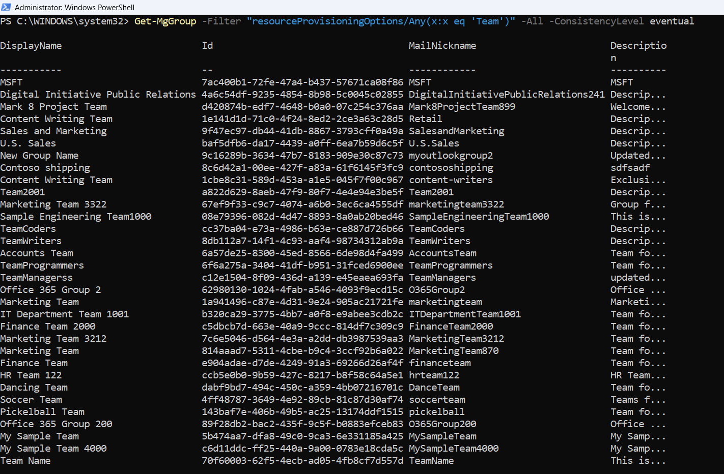 Get-MgGroup -Filter "resourceProvisioningOptions/Any(x:x eq 'Team')" -All -ConsistencyLevel eventual |