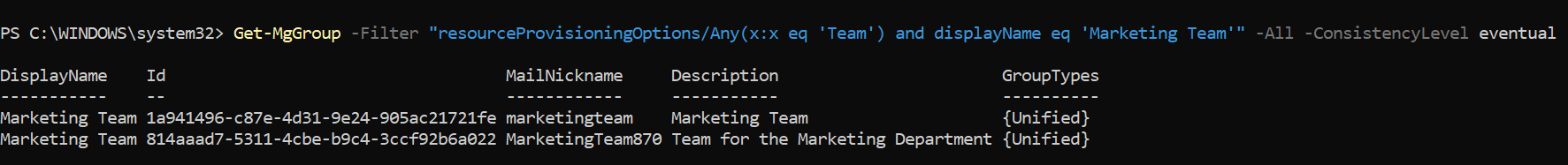 Get-MgGroup -Filter "resourceProvisioningOptions/Any(x:x eq 'Team') and displayName eq 'Marketing Team'" -All -ConsistencyLevel eventual