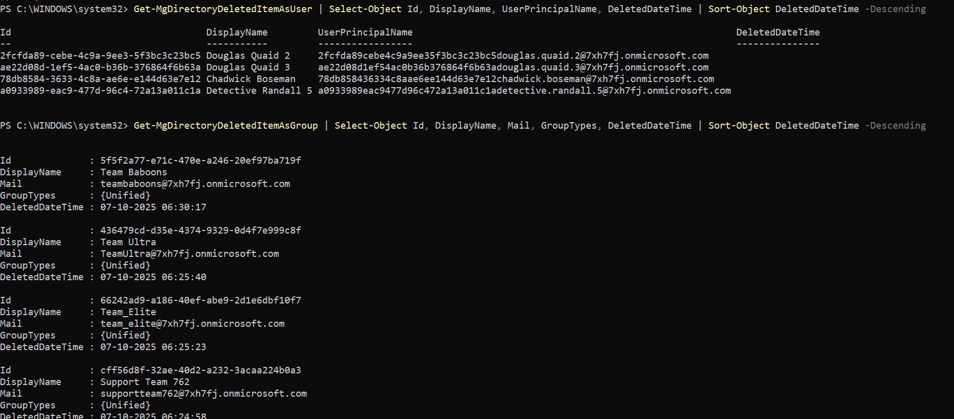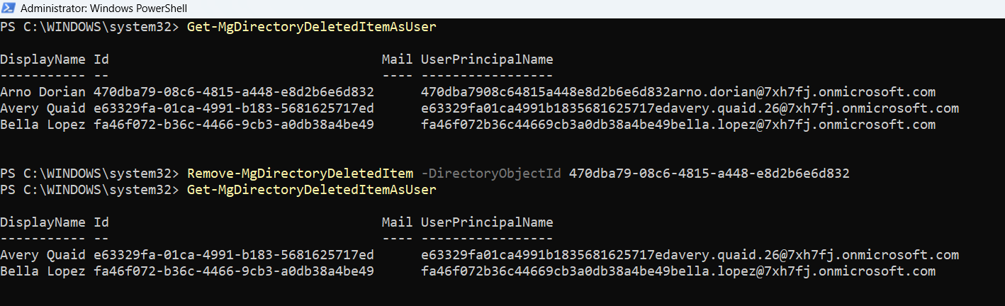 You can also confirm the deletion by running Get-MgDirectoryDeletedItemAsUser or Get-MgDirectoryDeletedItemAsGroup, depending on your requirements.
