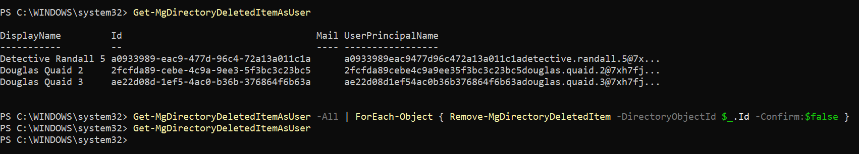 Get-MgDirectoryDeletedItemAsUser -All | ForEach-Object { Remove-MgDirectoryDeletedItem -DirectoryObjectId $_.Id -Confirm:$false }