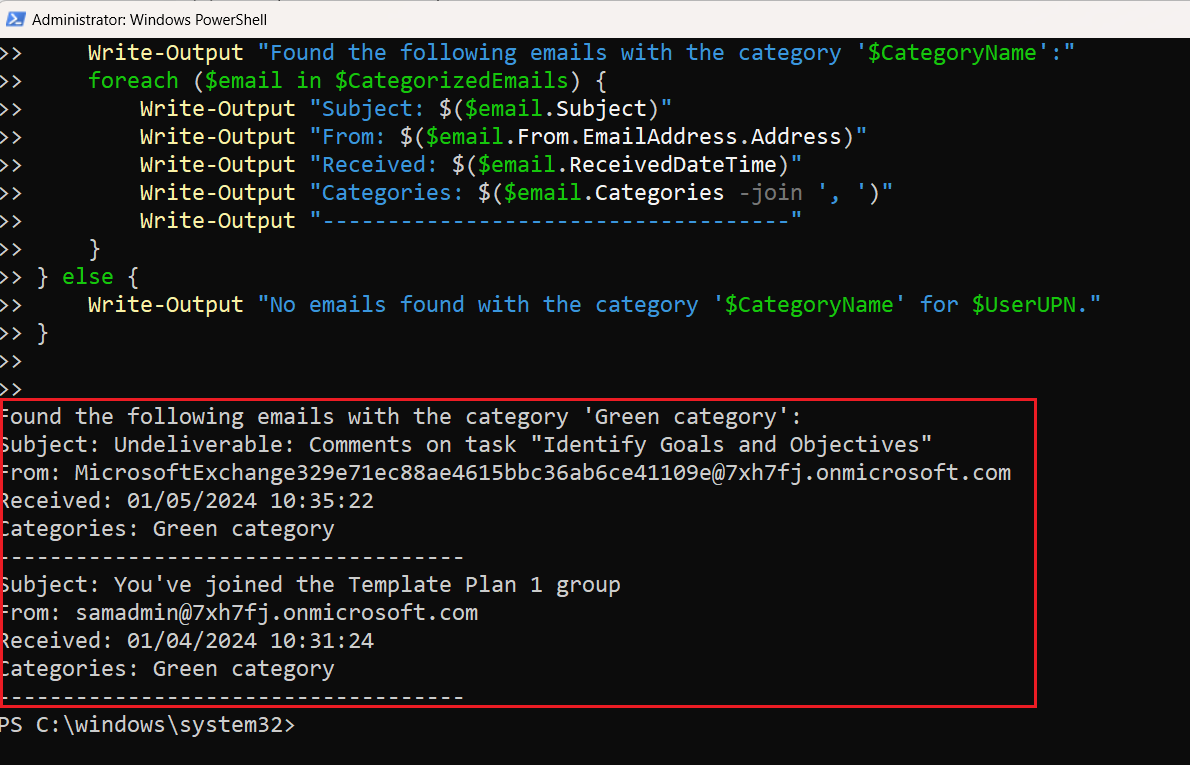 Write-Output "Found the following emails with the category '$CategoryName':"