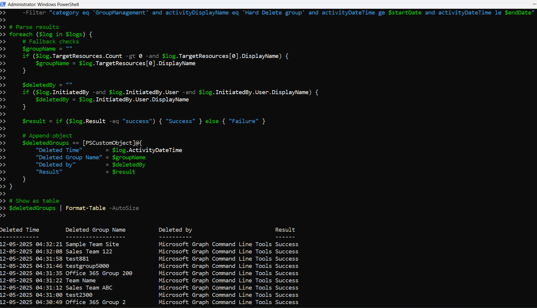Microsoft 365 administrators must keep an eye on group deletions β especially hard deletions which are permanent. This Graph PowerShell script offers a practical and reliable way to retrieve and audit such activity efficiently.
