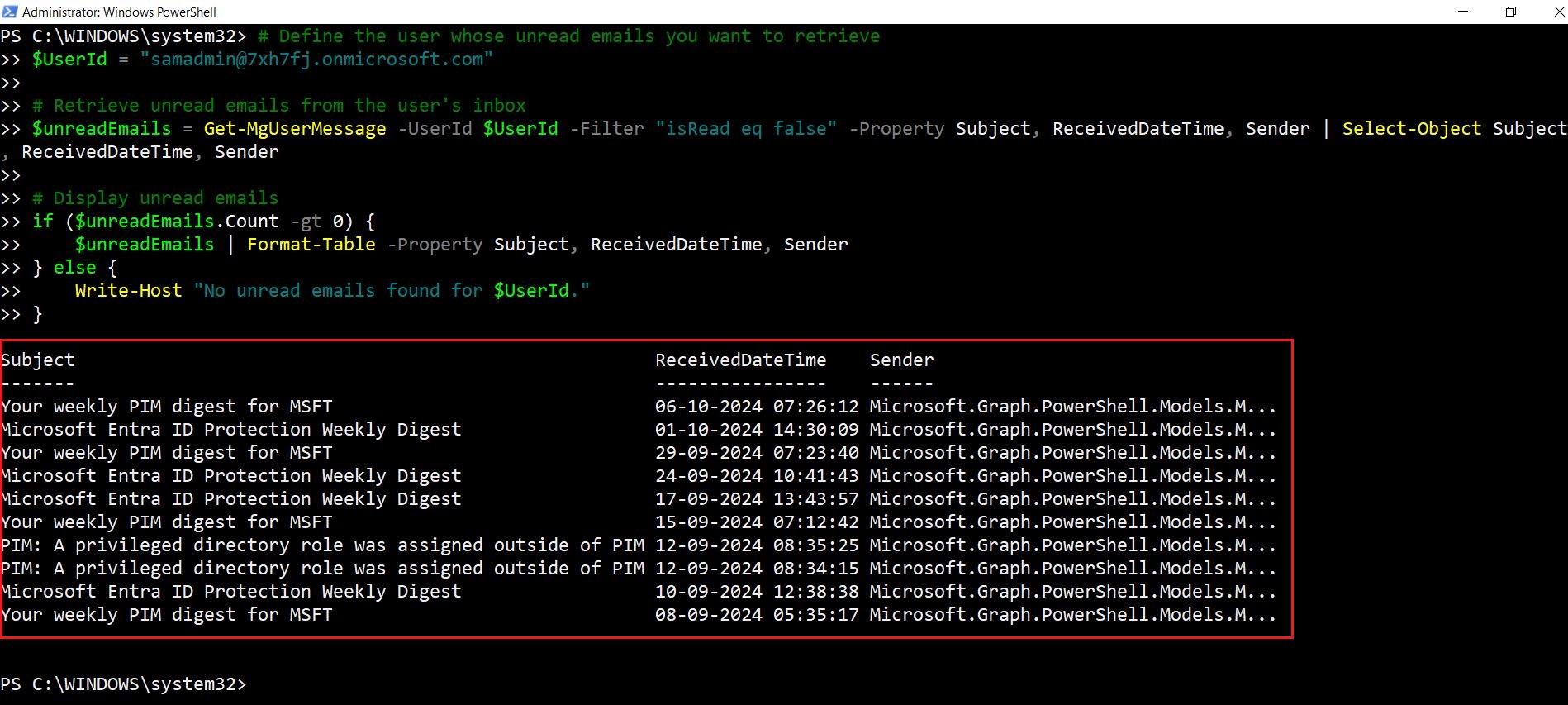 $unreadEmails = Get-MgUserMessage -UserId $UserId -Filter "isRead eq false" -Property Subject, ReceivedDateTime, Sender | Select-Object Subject, ReceivedDateTime, Sender