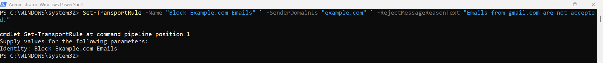 | Conflicting conditions/actions | Mutually exclusive parameters used together | Check the rule’s current config with `Get-TransportRule -Identity " |