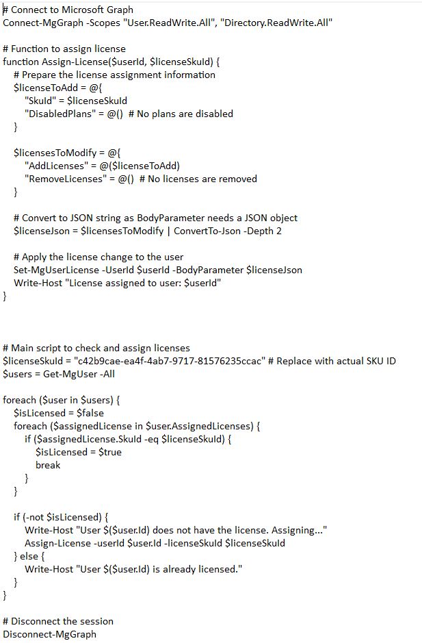 - A nested foreach loop checks for assignedLicenses property. If it contains the license SkuID, then the script prints out "User is already licensed" message. If not, the Assign-License function is called and the userId and licenseId are passed as parameters. Assign-License function uses Set-MgUserLicense cmdlet to assign the license to the unlicensed users.