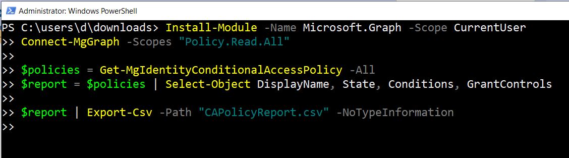 - Uses Get-MgIdentityConditionalAccessPolicy to fetch all the conditional access policies configured for your tenant.