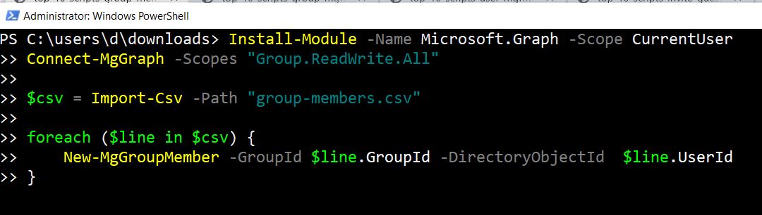 This script imports a list of users from the CSV file and adds them to the Microsoft 365 group. Your CSV file should contain GroupId and the UserId headers and the corresponding values.