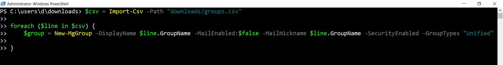 This script creates multiple M365 groups by importing group details from CSV file. Your CSV file should atleast contain the GroupName header for the script to work.