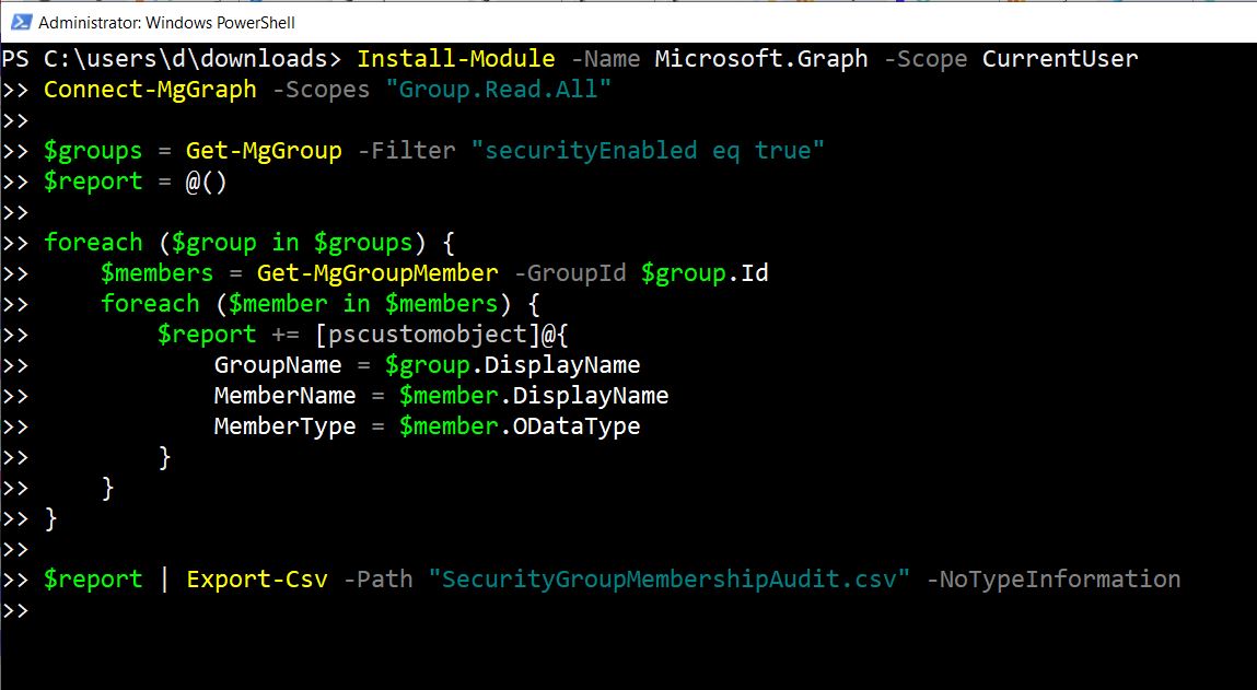 - Loops through the fetched security enabled groups and fetches members of these groups using Get-MgGroupMember cmdlet.