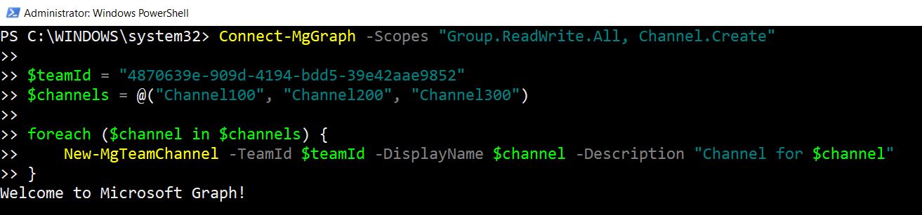 - Loops through $channels and executes New-MgTeamChannel cmdlet to create the channels you specified in the team.