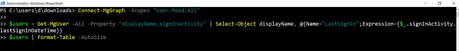 - Retrives the user information (including the lastSignInDateTime property), formats the output and displays it on the console.