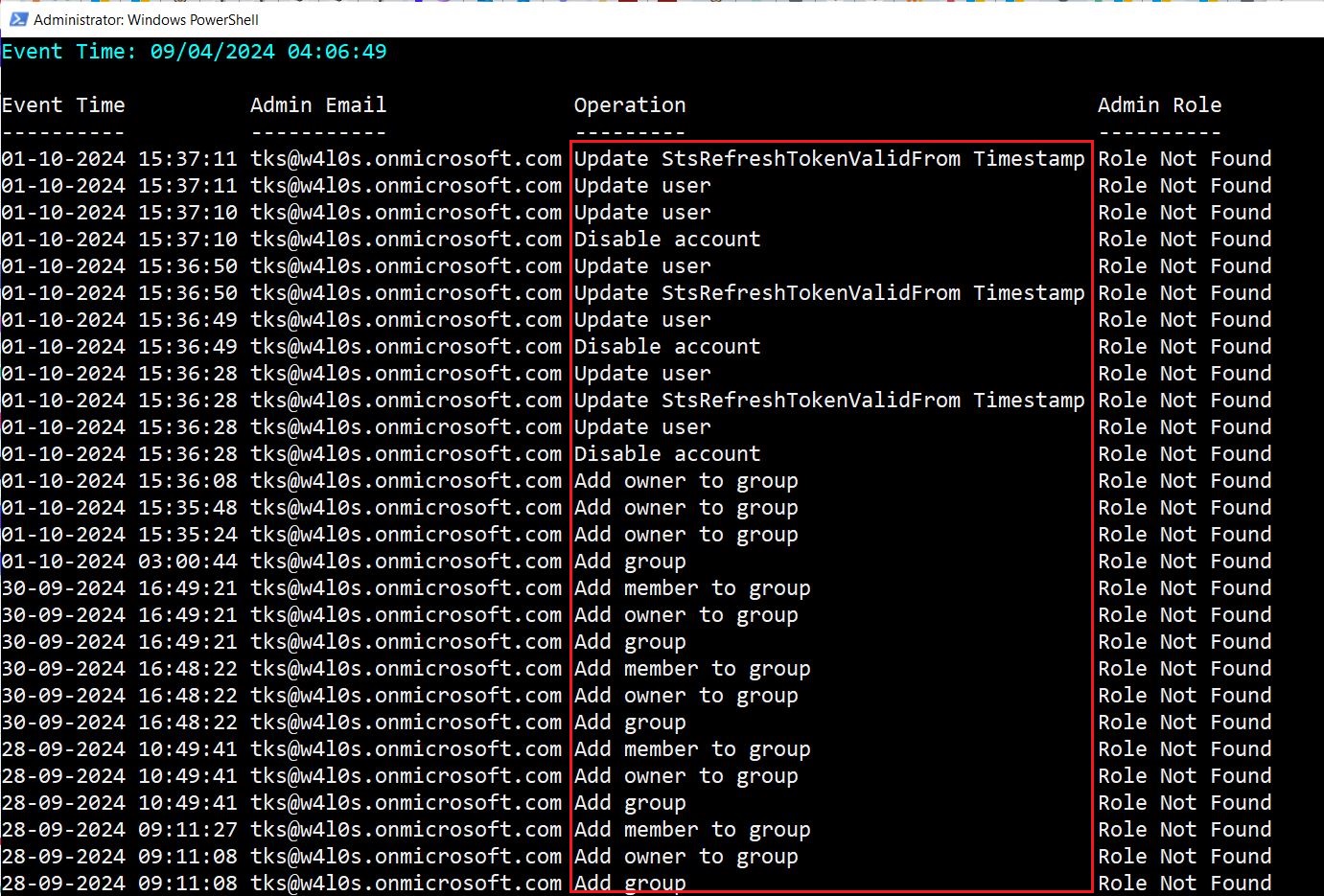 Monitoring administrative activities is crucial for ensuring the security and compliance of your Microsoft 365 environment. Admins frequently perform sensitive actions such as updating user roles, adding new groups, and consenting to applications, all of which should be logged and monitored. This article demonstrates how to use Microsoft Graph PowerShell to track these activities by logging admin operations from the Azure AD audit logs. We will walk through a custom script that provides detailed logging of admin activities, including the time of the event, the admin’s email, the operation performed, and the admin’s role.