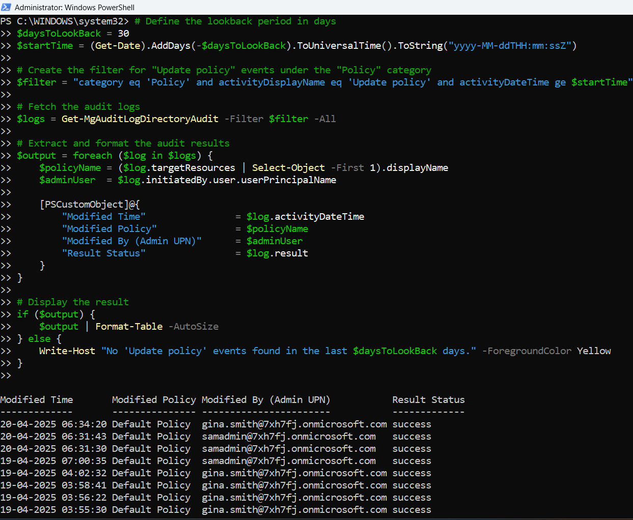 The script defines a variable $daysToLookBack, allowing you to audit policy updates over the past 7, 14, or 30 days.