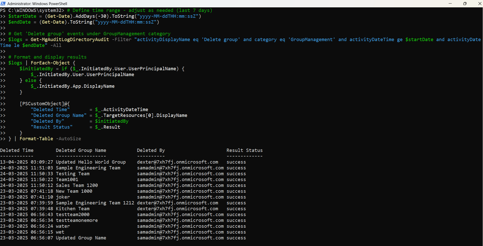 In this article, we’ll walk through a Graph PowerShell script that fetches "Delete group" events under the GroupManagement category, showing exactly when a group was deleted, who deleted it, and whether the action was successful.