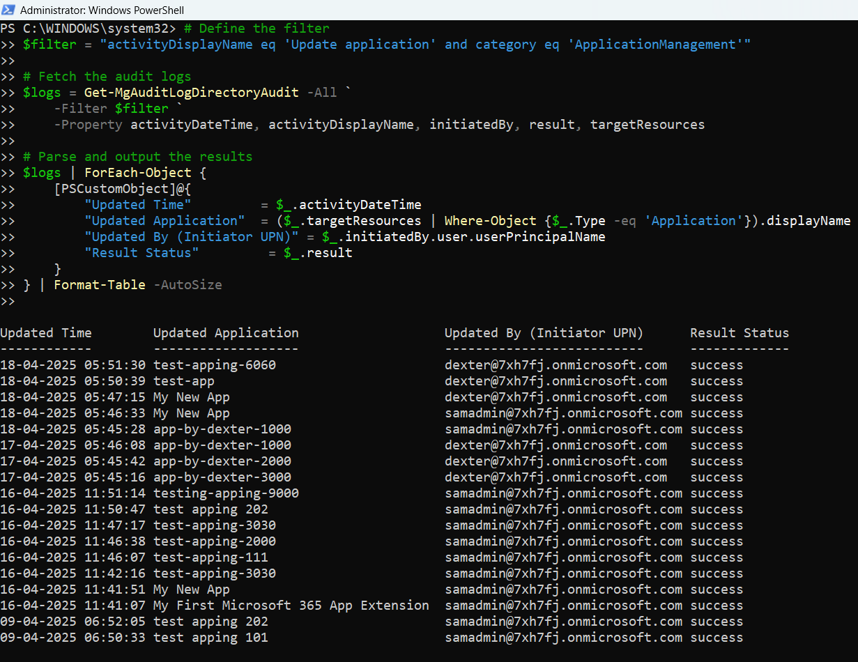 Keeping track of application updates is crucial for safeguarding your Microsoft 365 environment. This Microsoft Graph PowerShell script provides a streamlined and efficient way to monitor "Update application" events. By integrating enhancements like automated runs, CSV exports, and alerts, organizations can ensure continuous visibility into changes affecting their applications. Regular monitoring fosters better security practices, maintains compliance, and helps respond swiftly to incidents involving application modifications.