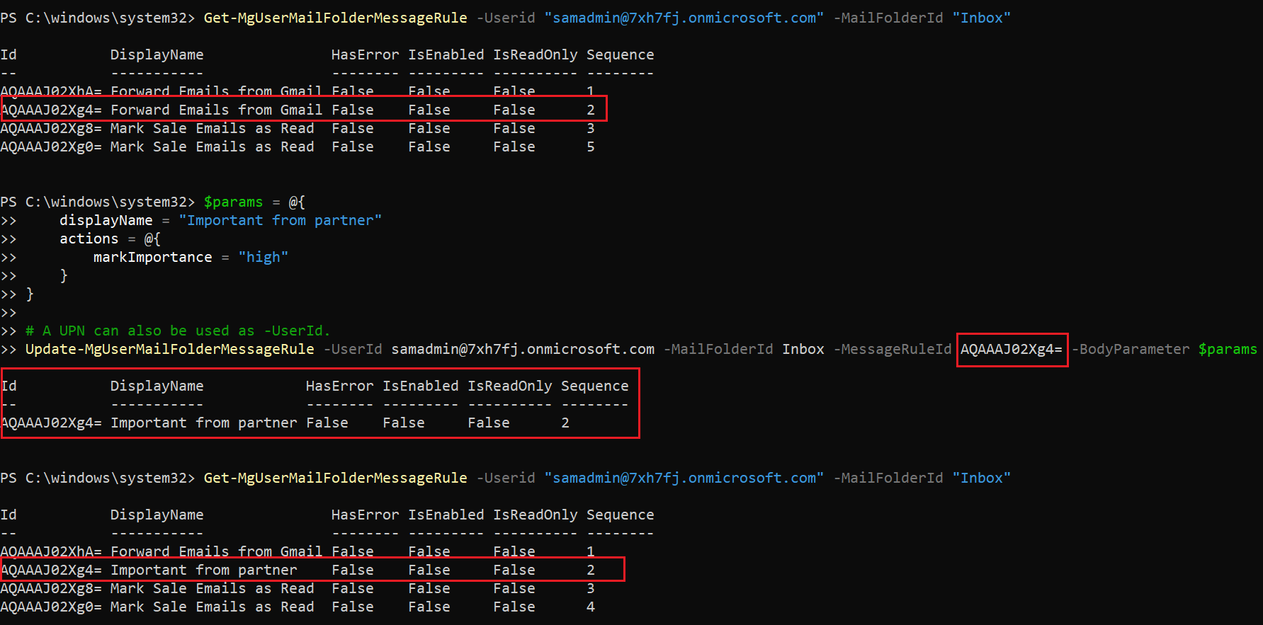 AQAAAJ02Xg4= in the "Inbox" of the user samadmin@7xh7fj.onmicrosoft.com is updated.Note: Use the Get-MgUserMailFolderMessageRule cmdlet to fetch the MessageRuleId required for the -MessageRuleId parameter.