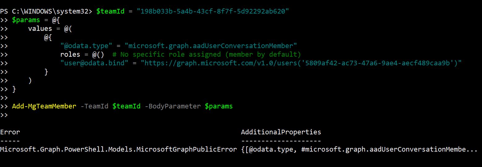 | Forbidden | The account executing the command lacks the necessary permissions. | Ensure that the executing user has sufficient Microsoft Teams administrator or member addition permissions. You may need to assign more Graph API permissions to the account. |