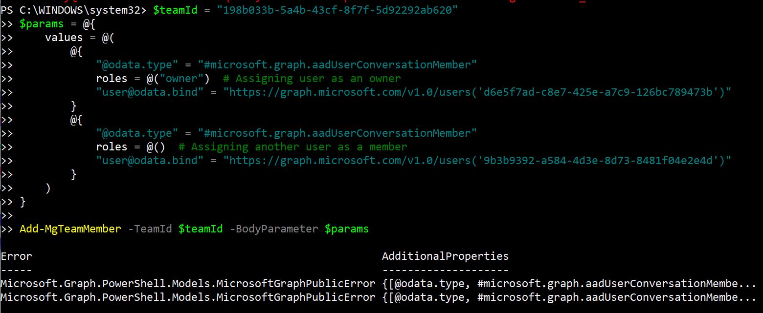 Note New-MgTeamMember is the alternative to Add-MgTeamMember cmdlet. You can also use Invoke-MgGraphRequest to Add Microsoft Team Member