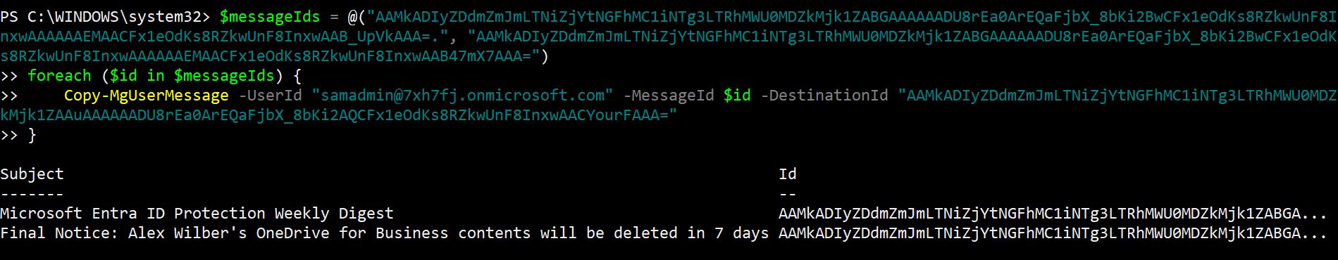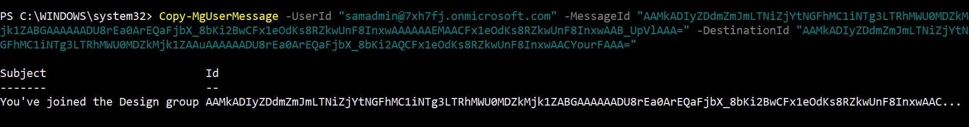 Copy-MgUserMessage -UserId "user@domain.com" -MessageId "AAMkAG..." -DestinationId "AQMkAG..."